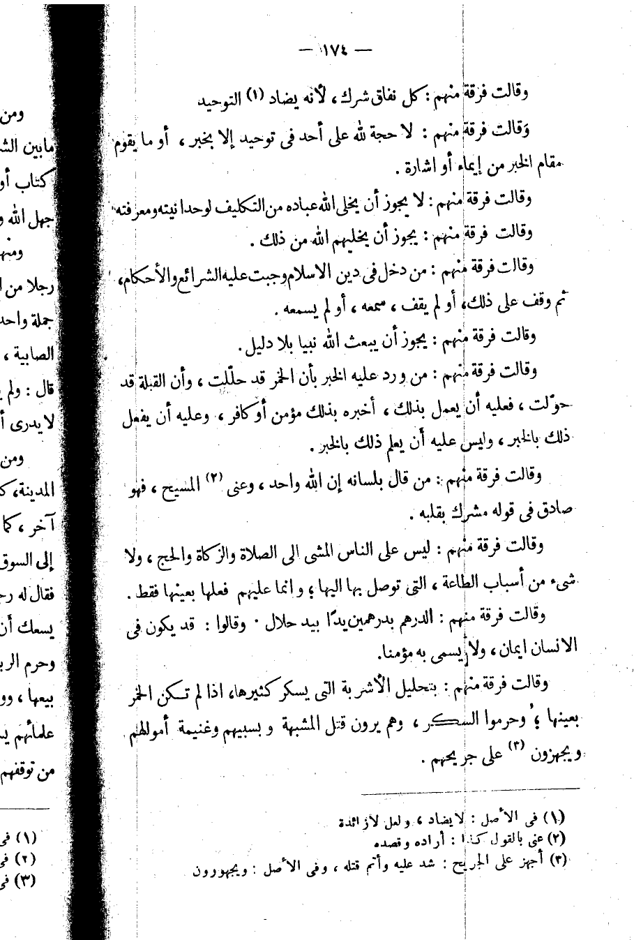 وقالت فرقة منهم: الدرهم بدرهمين يداً بيد حلال. وقالوا: قد يكون في الإنسان إيمان، ولا يسمى به مؤمناً.