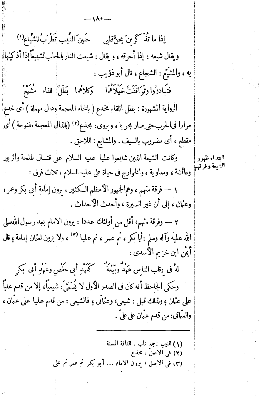 وفرقة منهم، أقل من أولئك عدداً: يرون الإمام بعد رسول الله صلى الله عليه وآله وسلم: أبا بكر، ثم عمر، ثم علياً، ولا يرون لعثمان إمامة؛ قال أيمن ابن خزيم الأسدي: