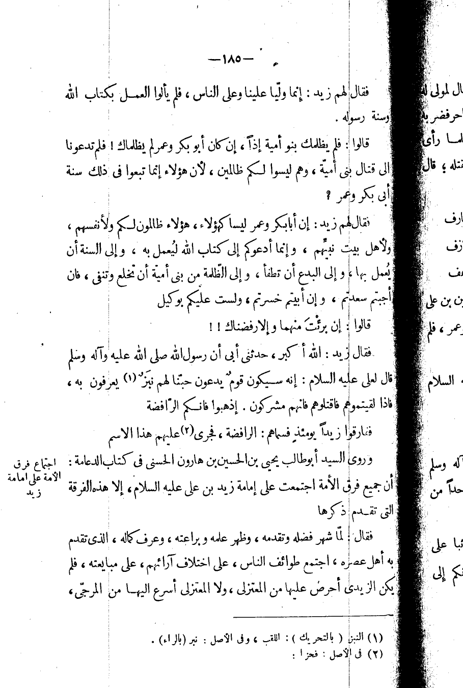 قالوا: إن برئت منهما وإلا رفضناك!! فقال زيد: الله أكبر، حدثني أبي أن رسول الله صلى الله عليه وآله وسلم قال لعلي عليه السلام: (إنه سيكون قوم يدعون حبنا لهم نبزٌ يعرفون به، فإذا لقيتموهم فاقتلوهم فإنهم مشركون) . اذهبوا فإنكم الرافضة.
