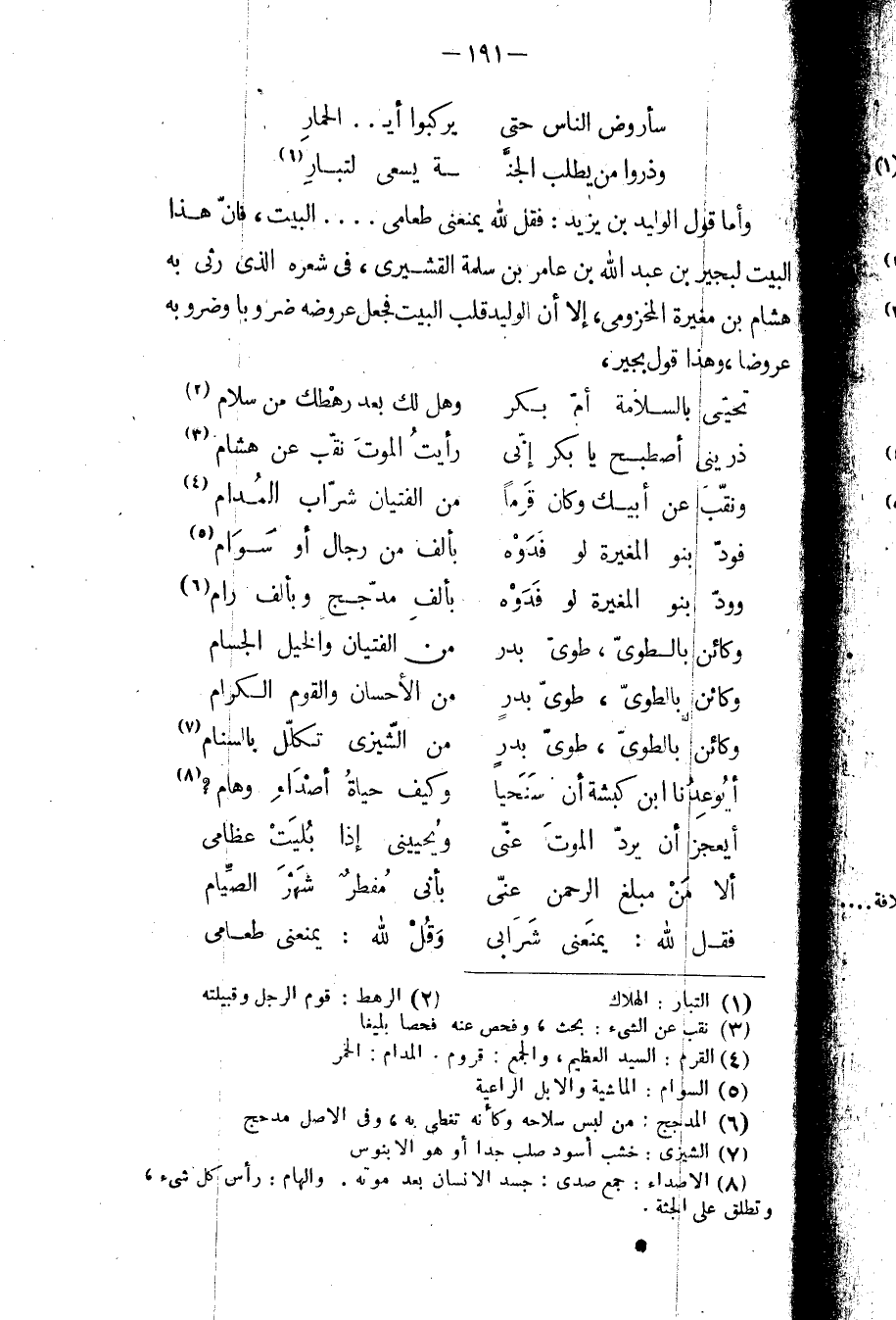 وأما قول الوليد بن يزيد: فقل لله يمنعني طعامي ... البيت، فإن هذا البيت لبجير بن عبد الله بن عامر بن سلمة القشيري، في شعره الذي رثى به هشام بن مغيرة المخزومي، إلا أن الوليد قلب البيت فجعل عروضه ضروباً وضروبه عروضاً، وهذا قول بجير: