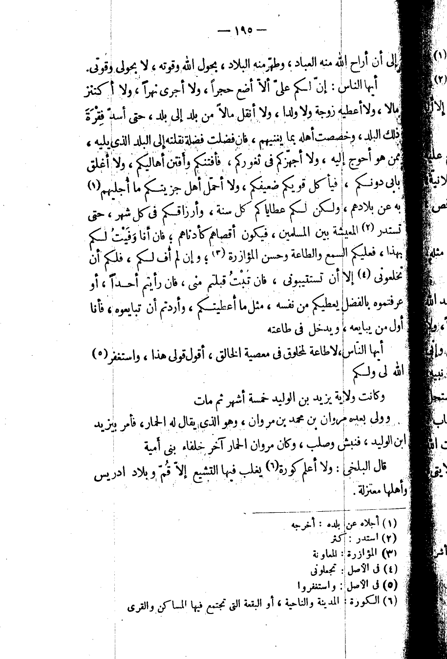 أيها الناس: إن لكم علي ألا أضع حجراً، ولا أجري نهراً، ولا أكتنز مالاً، ولا أعطيه زوجة ولا ولداً، ولا أنقل مالاً من بدل إلى بلد، حتى أسد فقرة ذلك البلد، وخصصت أهله بما يغنيهم، فإن فضلت فضلة نقلته إلى البلد الذي يليه، ممن هو أحوج إليه، ولا أجهزكم في ثغوركم، فأفتنكم وفتن أهاليكم، ولا أغلق بابي دونكم، فيأكل قويكم ضعيفكم، ولا أحمل أهل جزيتكم ما أجليهم به عن بلادهم، ولكن لكم عطاياكم كل سنة، وأرزاقكم في كل شهر، حتى تستدر المعيشة بين المسلمين، فيكون أقصاهم كأدناهم؛ فإن أنا وفيت لكم بهذا، فعليكم السمع والطاعة وحسن المؤازرة؛ وإن لم أف لكم، فلكم أن تخلعوني إلا أن تستتيبوني، فإن تبت قبلتم مني، فإن رأيتم أحداً، أو عرفتموه بالفضل يعطيكم من نفسه، مثل ما أعطيتكم، وأردتم أن تبايعوه، فأنا أول من يبايعه، ويدخل في طاعته.