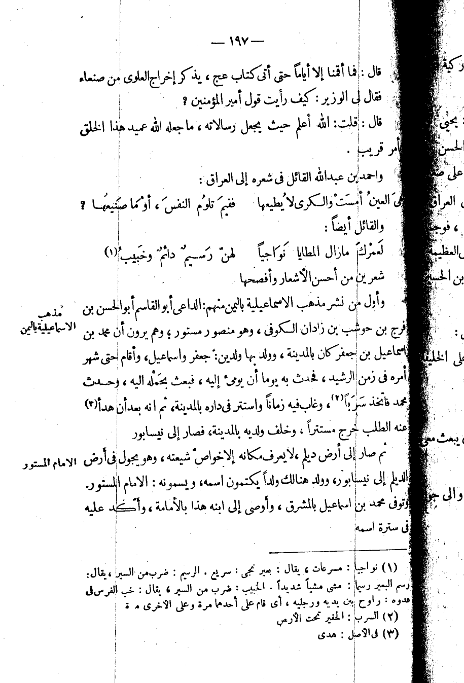 وأول من نشر مذهب الإسماعيلية باليمن منهم: الداعي أبو القاسم أبو الحسن بن فرج بن حوشب بن زادان الكوفي، وهو منصور مستور؛ وهم يرون أن محمد بن إسماعيل بن جعفر كان بالمدينة، وولد بها ولدين: جعفر وإسماعيل، وأقام حتى شهر أمره في زمن الرشيد، فحدث به يوماً أن يومئ إليه، فبعث بحمله إليه، وحدث محمد فاتخذ سرباً، وغاب فيه زماناً واستتر في داره بالمدين ة، ثم أنه بعد أن هدأ عنه الطلب خرج مستتراً، وخلف ولديه بالمدينة، فصار إلى نيسابور.