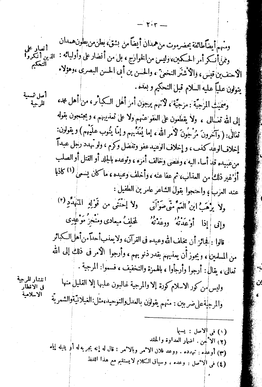 وسميت المرجية: مرجية، لأنهم يرجون أمر أهل الكبائر، من أهل محمد، إلى الله تعالى، ولا يقطعون على العفو عنهم ولا على تعذيبهم، ويحتجون بقوله تعالى: (وآخرون مرجون لأمر الله، إما يعذبهم وإما يتوب عليهم) ويقولون: إخلاف الوعد كذب، وإخلاف الوعيد عفو وتفضل وكرم، ولو تهدد رجل عبداً من عبيده قد أساء إليه، وعصى وخالف أمره، وتوعده بالجلد أو القتل أو الصلب أو غير ذلك من العذاب، ثم عفا عنه، وأخلف وعيده، ما كان يسمى كاذباً عند العرب؛ واحتجوا بقول الشاعر عامر بن الطفيل: