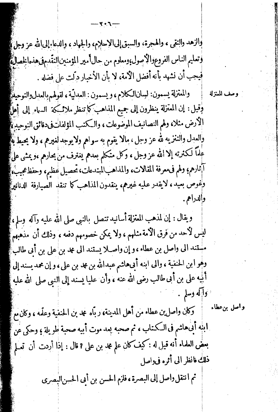 ويقال: إن لمذهب المعتزلة أسانيد تتصل بالنبي صلى الله عليه وآله وسلم، ليس لأحد من فرق الأمة مثلهم، ولا يمكن خصومهم دفعه، وذلك أن مذهبهم مستند إلى واصل بن عطاء، وإن واصلاً يستند إلى محمد بن علي بن أبي طالب وهو ابن الحنفية، وإلى ابنه أبي هاشم عبد الله بن محمد بن علي، وإن محمد يسند إلى أبيه علي بن أبي طالب رضي الله عنه، وأن علياً يسند إلى النبي صلى الله عليه وآله وسلم.