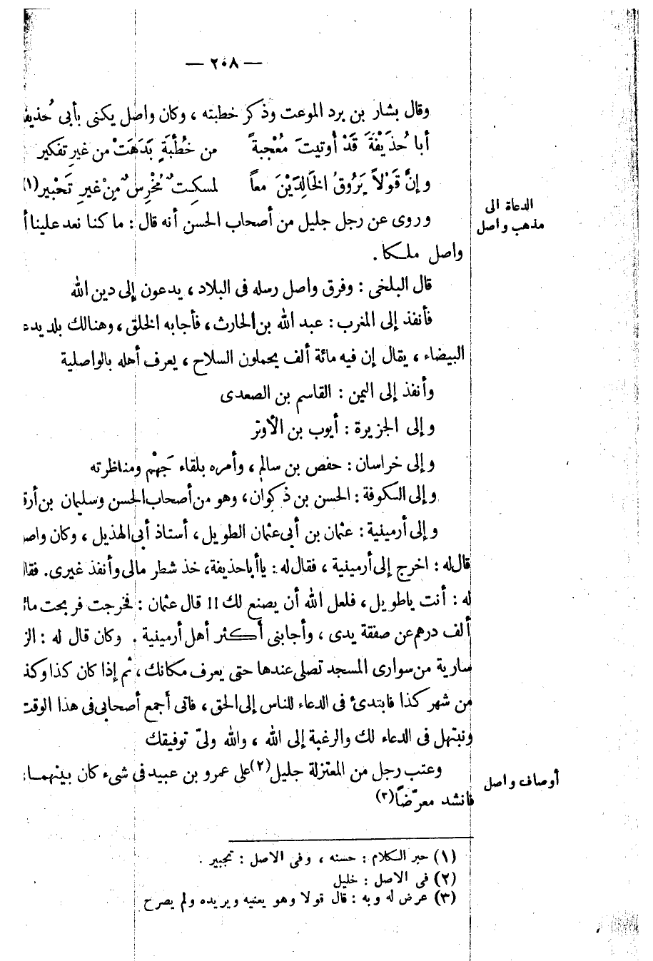 وإلى أرمينية: عثمان بن أبي عثمان الطويل، أستاذ أبي الهذيل، وكان واصل قال له: اخرج إلى أرمينية، فقال له: يا أبا حذيفة، خذ شطر مالي وأنفذ غيري. فقال له: أنت يا طويل، فلعل الله أن يصنع لك!! قال عثمان: فخرجت فربحت مائة ألف درهم عن صفقة يدي، وأجابني أكثر أهل أرمينية. وكان قال له: الزم سارية من سواري المسجد تصلي عندها حتى يعرف مكانك، ثم إذا كان كذا وكذا من شهر كذا فابتدئ في الدعاء للناس إلى الحق، فأتى أجمع أصحابي في هذا الوقت ونبتهل في الدعاء لك والرغبة إلى الله، والله ولي توفيقك.