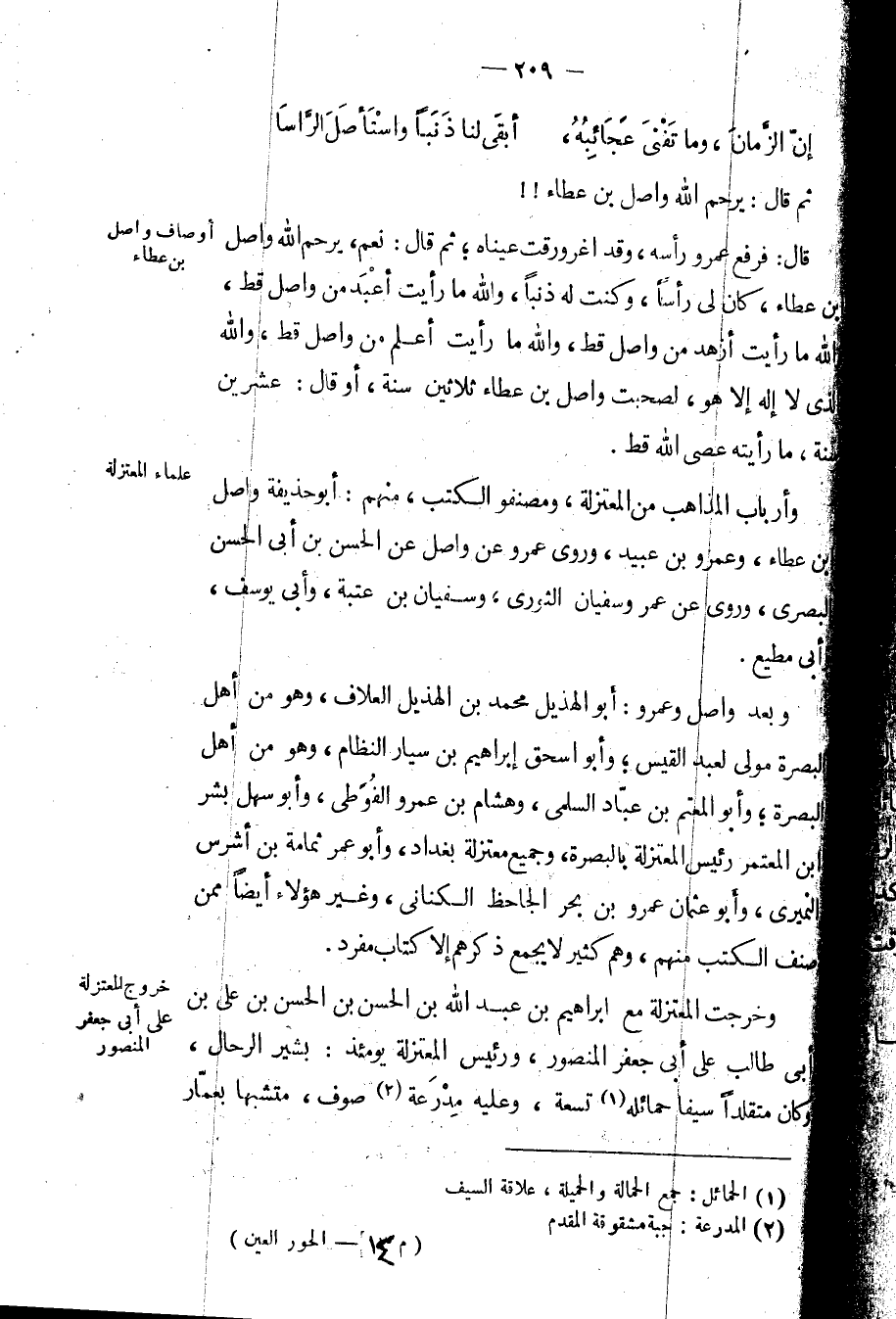 وخرجت المعتزلة مع إبراهيم بن عبد الله بن الحسن بن الحسن بن علي بن أبي طالب على أبي جعفر المنصور، ورئيس المعتزلة يومئذ: بشير الرحال، وكان متقلداً سيفاً حمائله تسعة، وعليه مدرعة صوف، متشبهاً بعمار