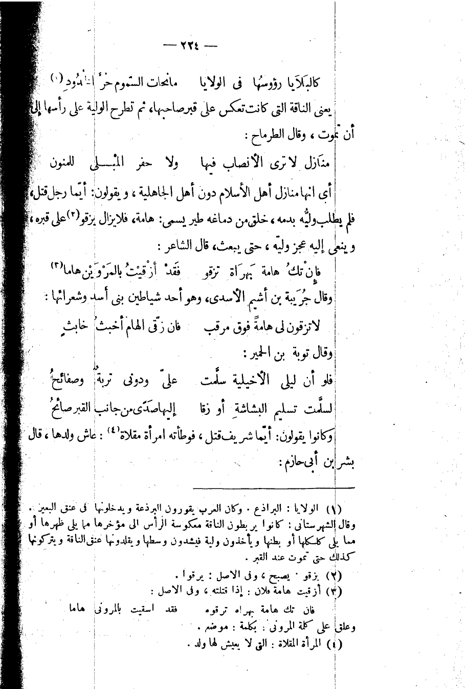 أي أنها منازل أهل الإسلام دون أهل الجاهلية، ويقولون: أيما رجل قتل، فلم يطلب وليه بدمه، خلق من دماغه طير يسمى: هامة، فلا يزال يزقو على قبره، وينعى إليه عجز وليه، حتى يبعث، قال الشاعر:
