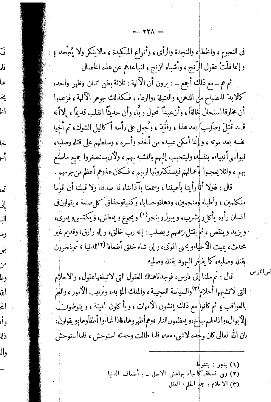ثم هم - مع ذلك أجمع -: يرون أن الآلهة: ثلاثة بطن اثنان وظهر واحد، كما لا بد للمصباح من الدهن، والفتيلة، والوعاء، فكذلك جوهر الآلهة، فزعموا أن مخلوقاً استحال خالقاً، وأن عبداً تحول رباً، ون حديثاً انقلب قديماً، إلا أنه قد قتل وصلب بعد هذا، وفقد، وجعل على رأسه أكاليل الشوك، ثم أحيا نفسه بعد موته، وإنما أمكن عبيده من أخذه وأسره، وسلطهم على قتله وصلبه، ليواسي أنبياءه بنفسه، وليتحبب إليهم بالتشبيه بهم، ولأن يستصغروا جميع ما صنع بهم، ولئلا يعجبوا بأعمالهم فيستكثرونها لربهم، فكان عذرهم أعظم من جرمهم.