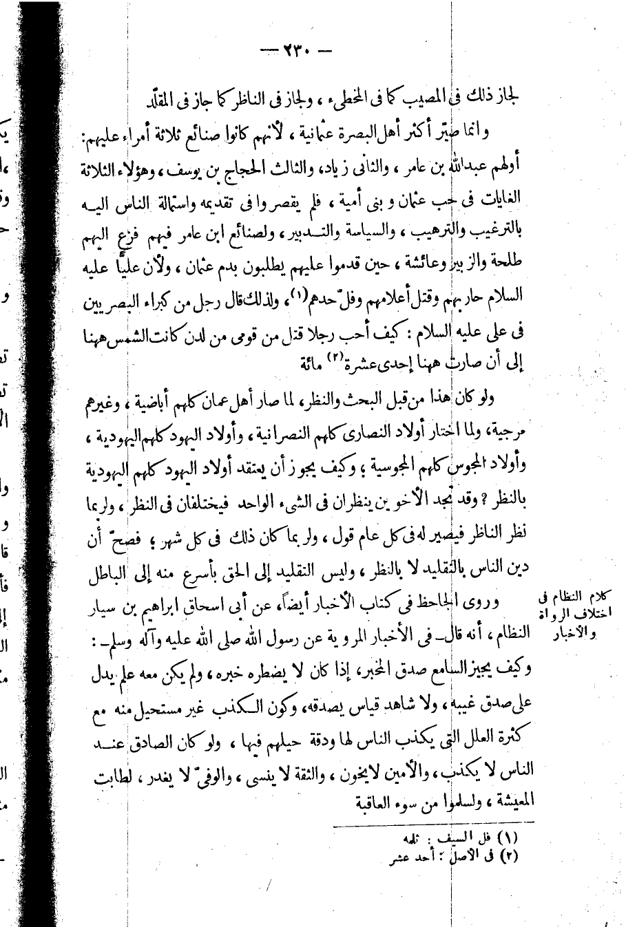 وروى الجاحظ في كتاب الأخبار أيضاً، عن أبي إسحاق إبراهيم بن سيار النظام، أنه قال - في الأخبار المروية عن رسول الله صلى الله عليه وآله وسلم -: وكيف يجيز السامع صدق المبخر، إذا كان لا يضطره خبره، ولم يكن معه علم يدل على صدق غيبه، ولا شاهد قياس يصدقه، وكون الكذب غير مستحيل منه مع كثرة العلل التي يكذب الناس لها ودقة حيلهم فيها، ولو كان الصادق عند الناس لا يكذب، والأمين لا يخون، والثقة لا ينسى، والوفي لا يغدر، لطابت المعيشة، ولسلموا من سوء العاقبة.