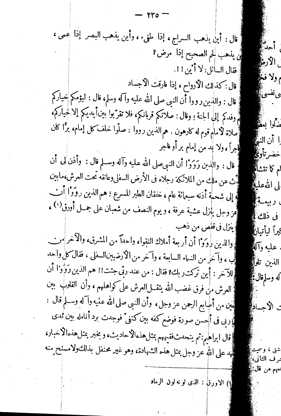 قال: أين يذهب السراج، إذا طفئ، وأين يذهب البصر إذا عمى، وأين يذهب لحم الصحيح إذا مرض؟ فقال السائل: لا أين!! قال: كذلك الأرواح، إذا فارقت الأجساد.