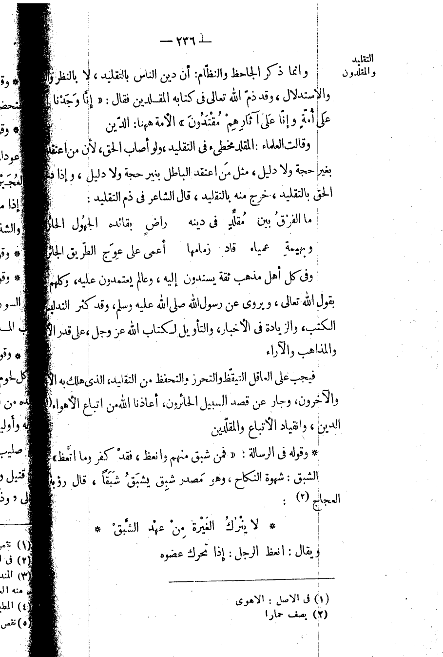 وإنما ذكر الجاحظ والنظام: أن دين الناس بالتقليد، لا بالنظر والبحث والاستدلال، وقد ذم الله تعالى في كتابه المقلدين فقال: (إنا وجدنا آباءنا على أمةٍ وإنا على آثارهم مقتدون) الأمة ههنا: الدين.