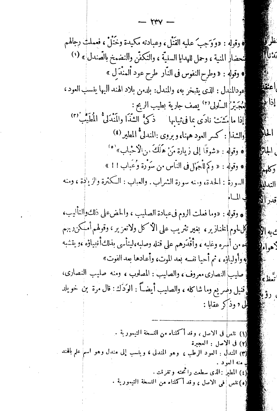 وقوله: وطرح النفوس في النار طرح عود المندل.