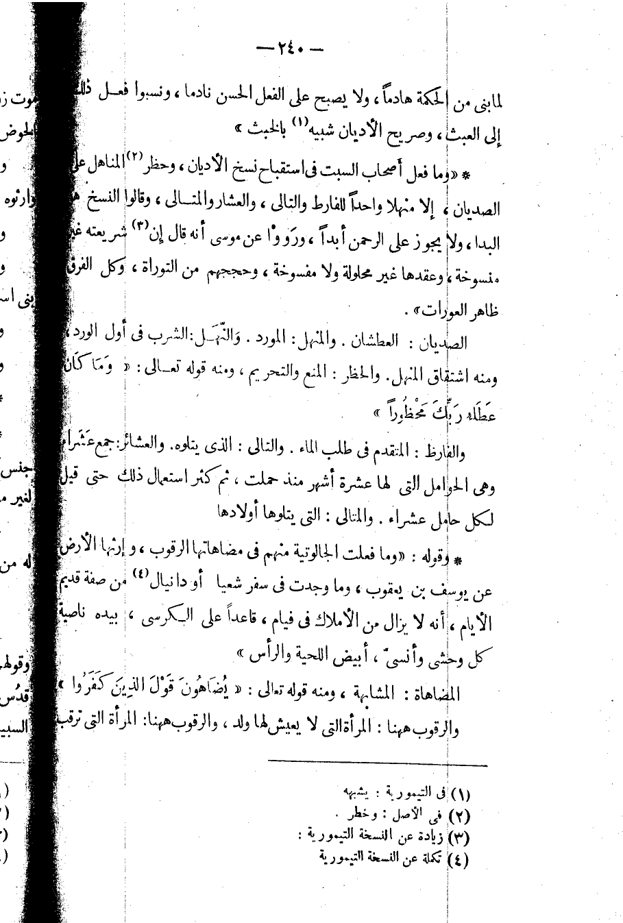 وما فعل أصحاب السبت في استقباح نسخ الأديان، وحظر المناهل على الصيدان، إلا منهلاً واحداً للفارط والتالي، والعشار والمتالي، وقالوا النسخ هو البدا، ولا يجوز على الرحمن أبداً، ورووا عن موسى أنه قال إن شريعته غير منسوخة، وعقدها غير محلولة ولا مفسوخة، وحججهم من التوراة، وكل الفرق ظاهر العورات.