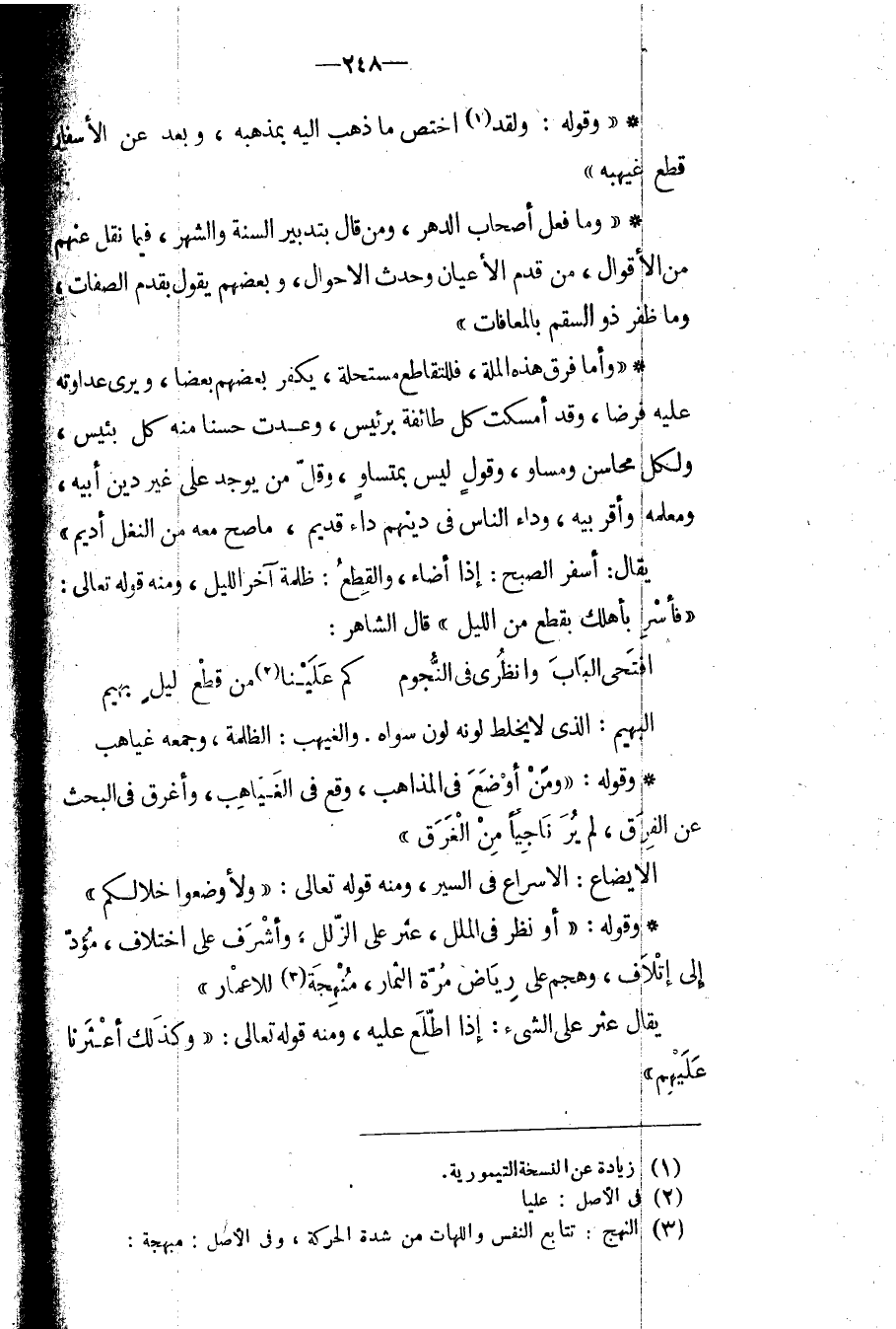 وقوله: أو نظر في املل، عثر على الزلل، وأشرف على اختلاف، مؤد إلى إتلاف، وهجم على رياض مرة الثمار، منهجة للأعمار.
