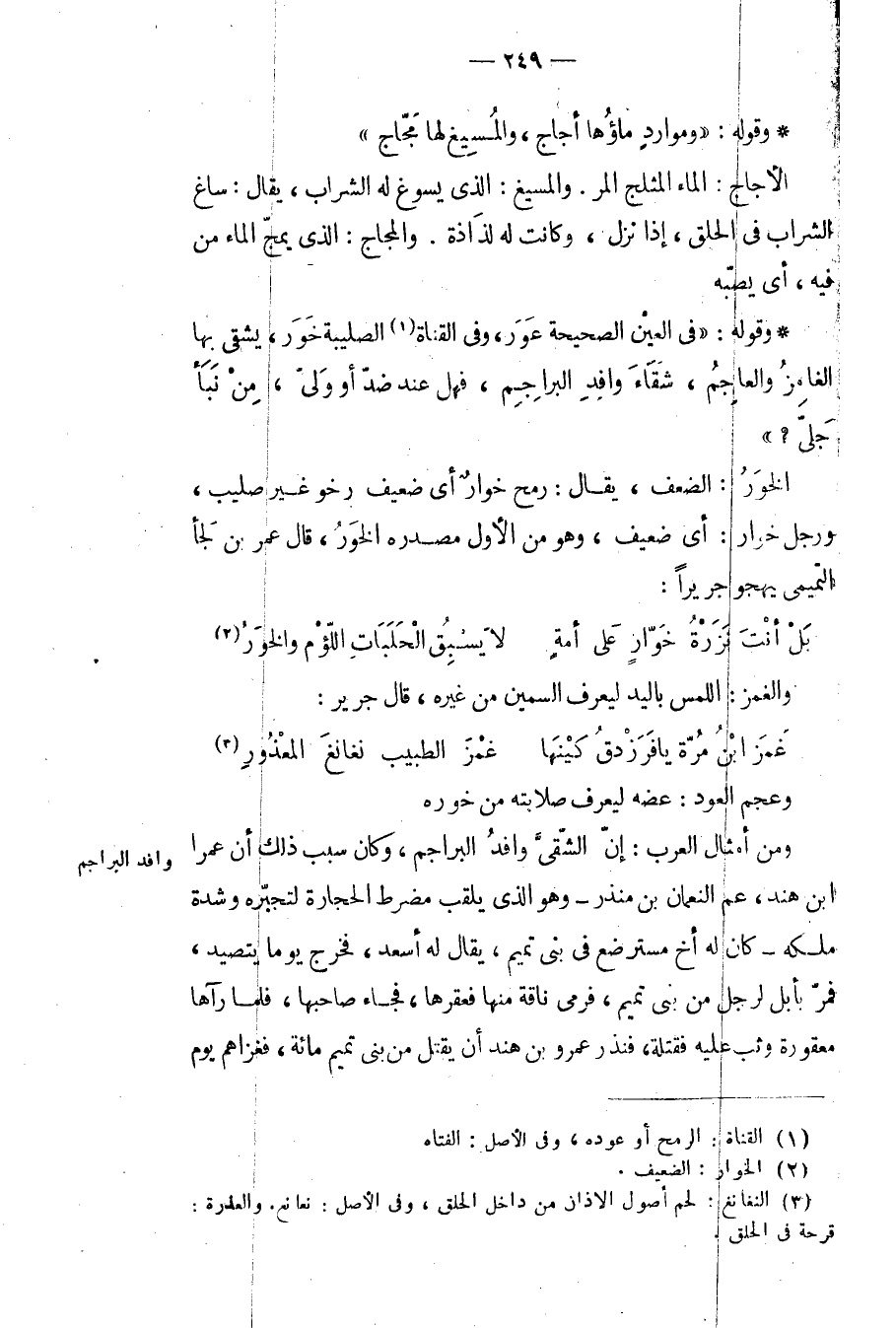 وقوله: في العين الصحيحة عور، وفي القناة الصليبة خور، يشقى بها الغامز والعاجم، شقاء وافد البراجم، فهل عند ضد أو ولي، من نب جلي؟ الخور: الضعف، يقال: رمح خوارٌ أي ضعيف رخو غير صليب، ورجل خوار: أي ضعيف، وهو من الأول مصدره الخور، قال عمر بن لجأ التميمي يهجو جريراً: