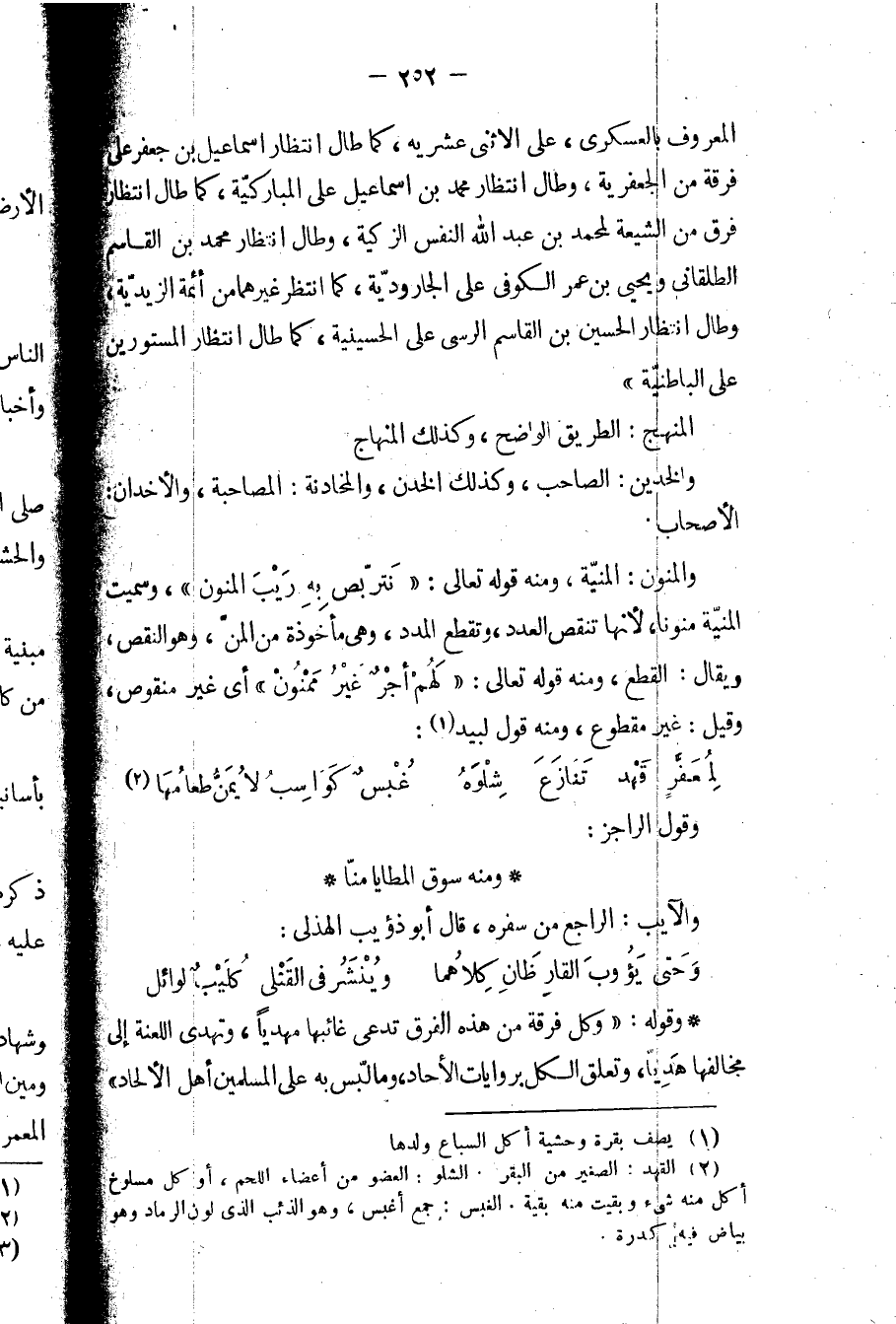 والمنون: المنية، ومنه قوله تعالى: (نتربص به ريب المنون) ، وسميت المنية منوناً، لأنها تنقص العدد، وتقطع المدد، وهي مأخوذة من المن، وهو النقص، ويقال: القطع، ومنه قوله تعالى: (لهم أجرٌ غير ممنون) أي غير منقوص، وقيل: غير مقطوع، ومنه قول لبيد: