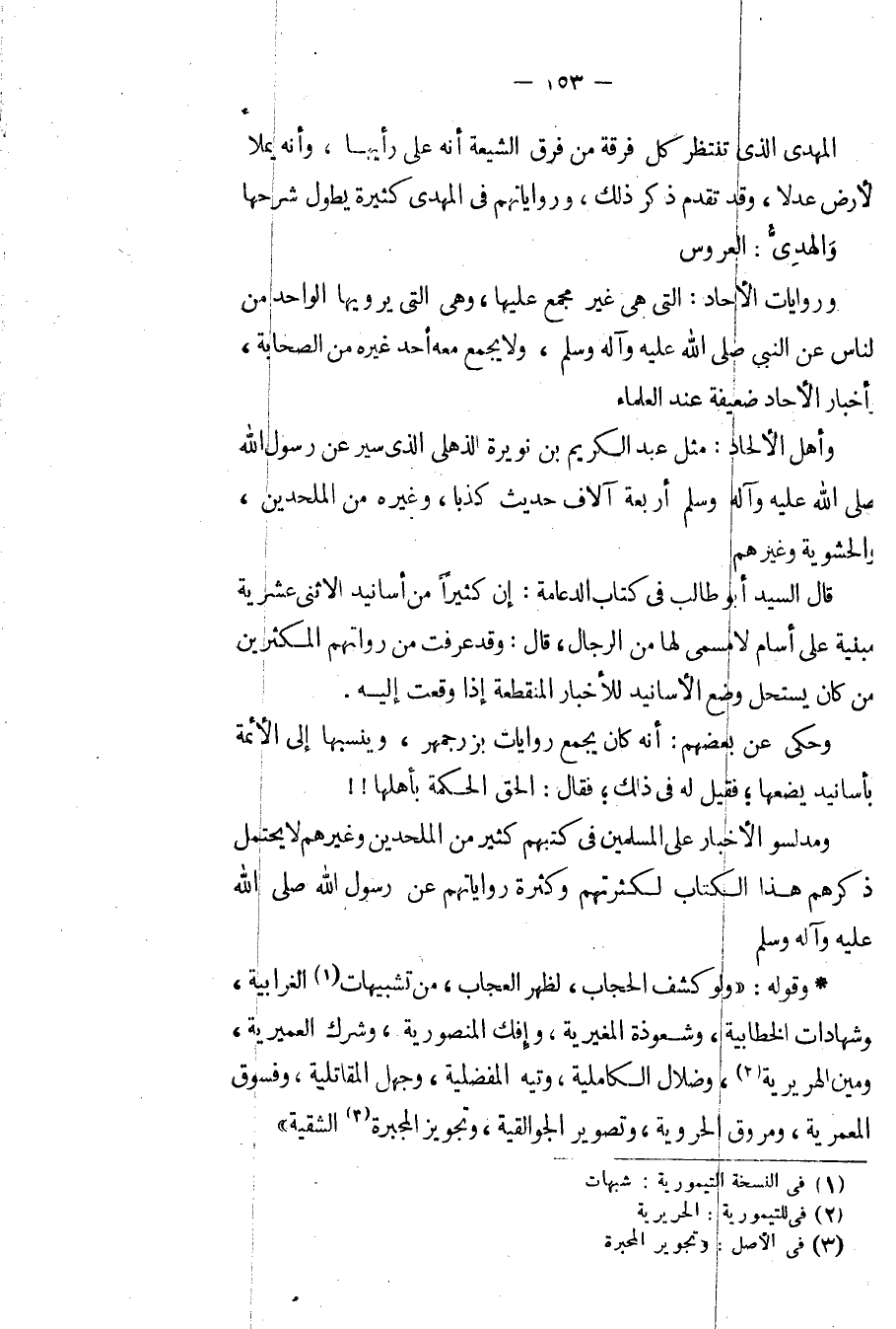 وقوله: ولو كشف الحجاب، لظهر العجاب، من تشبيهات الغرابية، وشهادات الخطابية، وشعوذة المغيرة، وإفك المنصورية، وشرك العميرية، ومين الهريرية، وضلال الكاملية، وتيه المفضلية، وجهل المقاتلية، وفسوق المعمرية، ومروق الحروية، وتصوير الجوالقية، وتجويز المجبرة الشقية.
