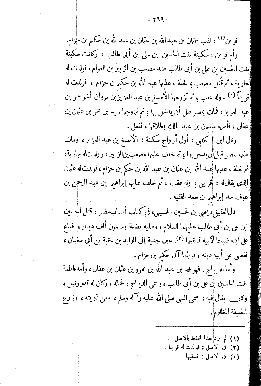 وقال ابن الكلبي: أول أزواج سكينة: الأصبغ بن عبد العزيز، ومات عنها بمصر قبل أن يدخل بها؛ ثم خلف عليها مصعب بن الزبير، وولدت له جارية، ثم خلف عليها عبد الله بن عثمان بن عبد الله بن حكم بن حزام، فولدت له عثمان الذي يقال له: قرين، وله عقب، ثم خلف عليها إبراهيم بن عبد الرحمن بن عوف جد إبراهيم بن سعد الفقيه.