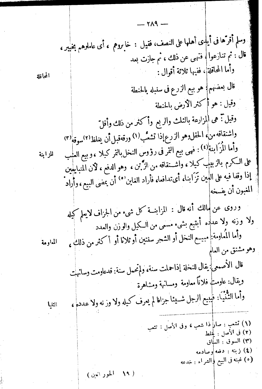 وأما المزابنة: فهي بيع التمر في رؤوس النخل بالتمر كيلا، وبيع العنب على الكرم بالزبيب كيلا، واشتقاقه من الزبن، وهو الدفع، لأن المتبايعين إذا وقفا فيه على العين تزابنا، ي تدافعا، فأراد الغابن أن يمضي البيع، وأراد المغبون أن يفسخه.