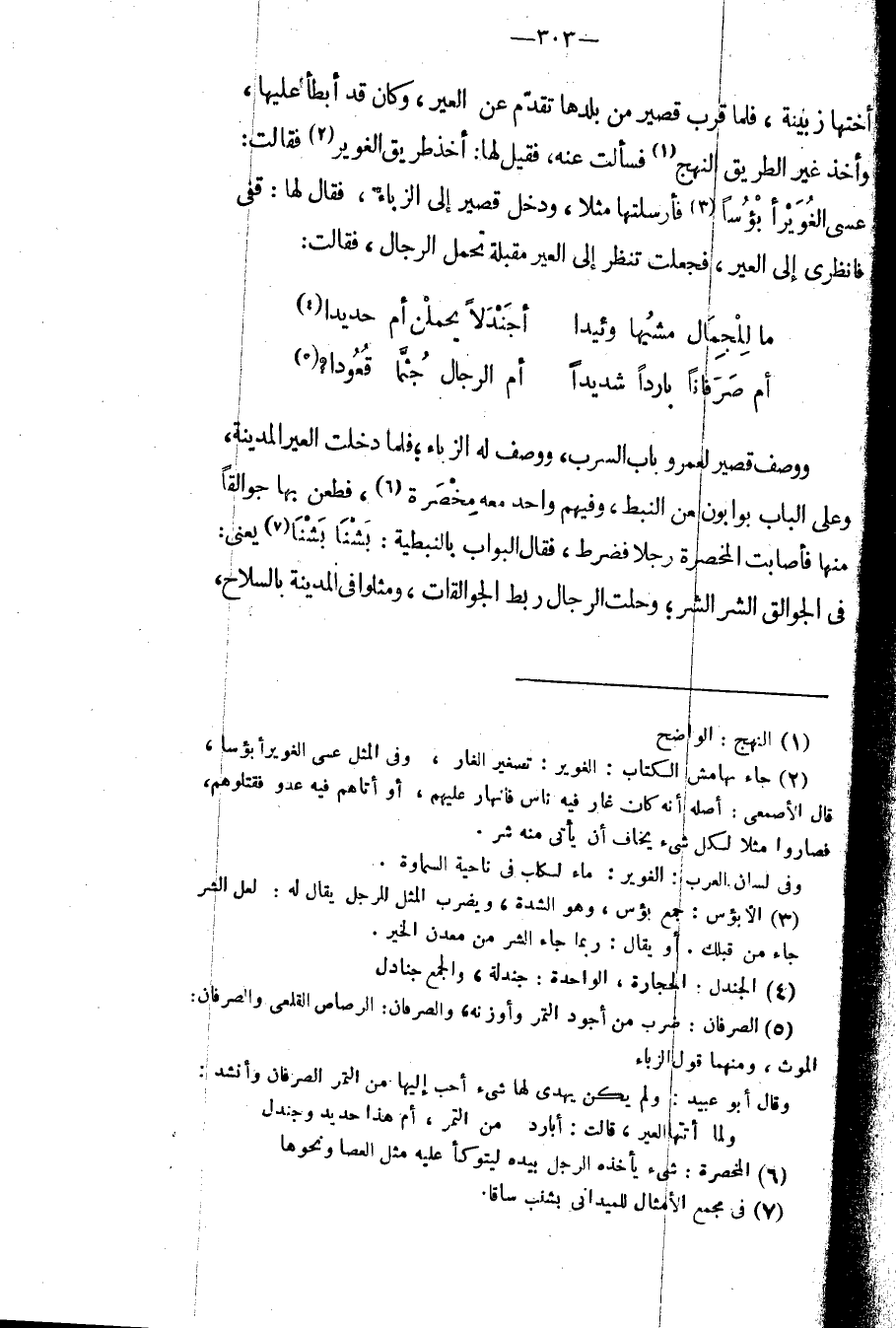 ووصف قصير لعمرو باب السرب، ووصف له الزباء؛ فلما دخلت العير المدينة، وعلى الباب بوابون من النبط، وفيهم واحد معه مخصرة، فطعن بها جوالقاً منها فأصابت المخصرة رجلاً فضرط، فقال البواب بالنبطية: بشناً بشناً يعني: في الجوالق الشر الشر؛ وحلت الرجال ربط الجوالقات، ومثلوا في المدينة بالسلاح،