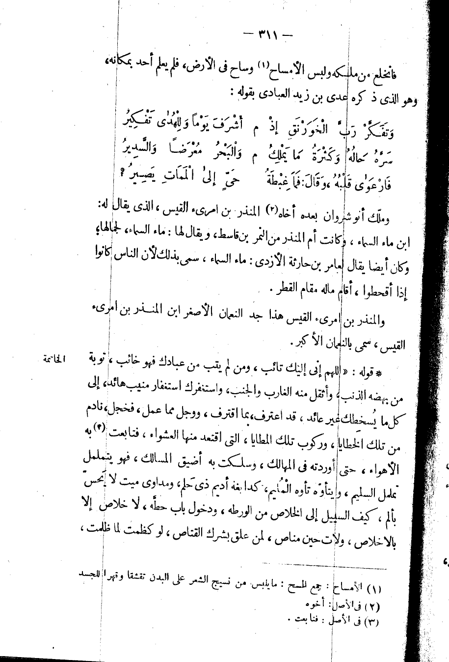 فانخلع من ملكه ولبس الأمساح وساح في الأرض، فلم يعلم أحد بمكانه، وهو الذي ذكره عدي بن زيد العبادي بقوله: