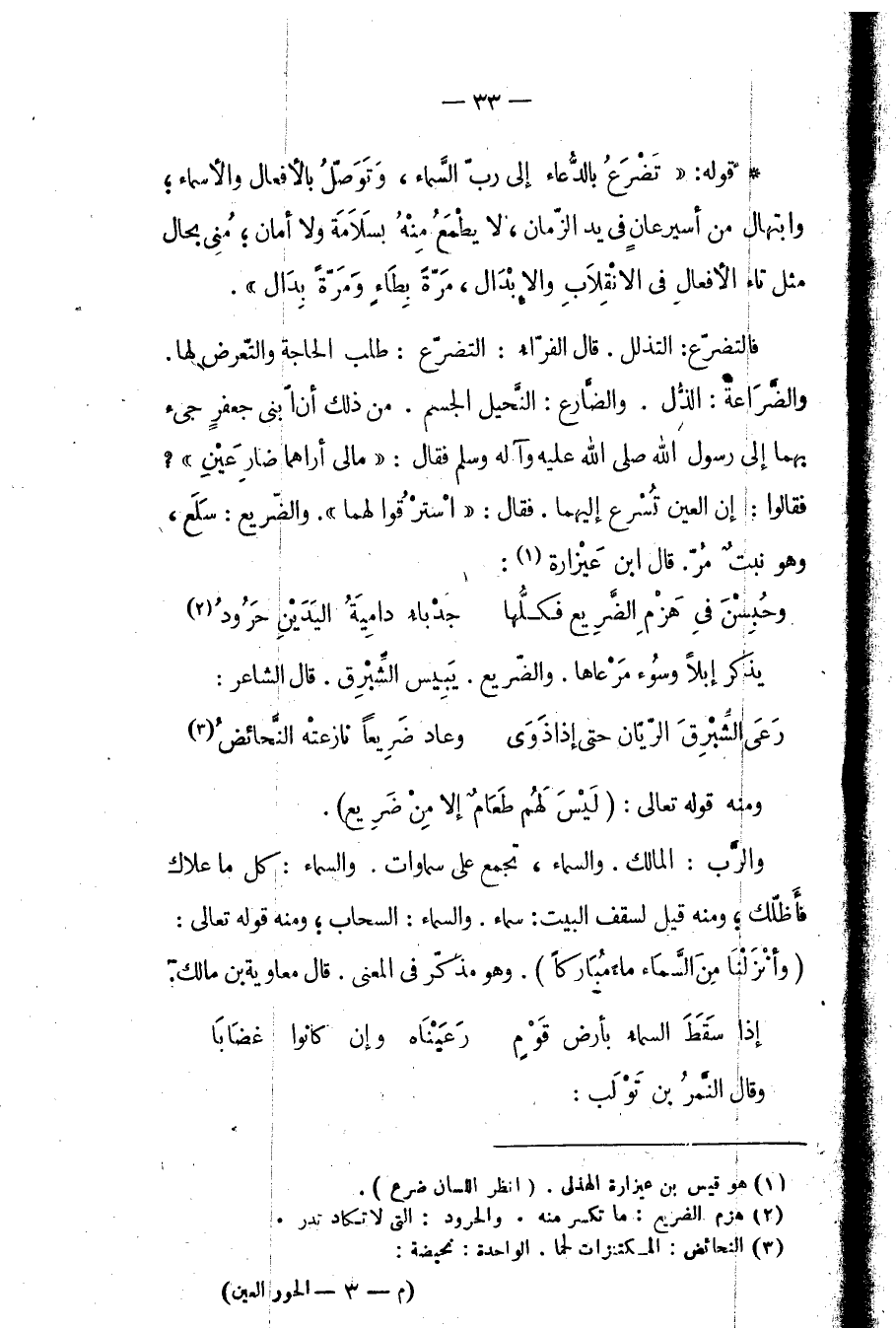 فالتضرع: التذلل. قال الفراء: التضرع: طلب الحاجة والتعرض لها. والضراعة: الذل. والضارع: النحيل الجسم. من ذلك أن ابنى جعفر جيء بهما إلى رسول الله صلى الله عليه وسلم فقال: (ما لي أرهما ضارعين) ؟ فقالوا: إن العين تسرع إليهما. فقال: (استرقوا لهما) . والضريع: سلع، وهو نبت مر. قال ابن عيزارة: