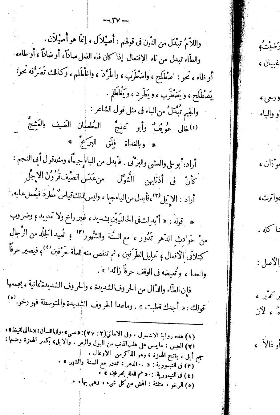 والطاء تبدل من تاء الافتعال إذا كان فاء الفعل صاداً، أو ضاداً، أو طاء، أو ظاء، نحو: اصطلح، واضطرب، واطرد، واظطلم، وكذلك تصرفه نحو: يصطلح، ويضطرب، ويطرد، ويظطلم.