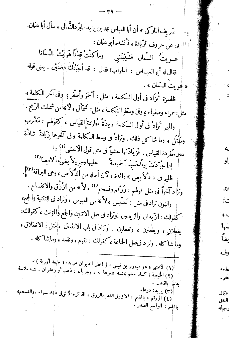 بالتصريف الملوكي، أن أبا العباس محمد بن يزيد المبرد الثمالي، سأل أبا عثمان المازني عن حروف الزيادة، فأنشده أبو عثمان: