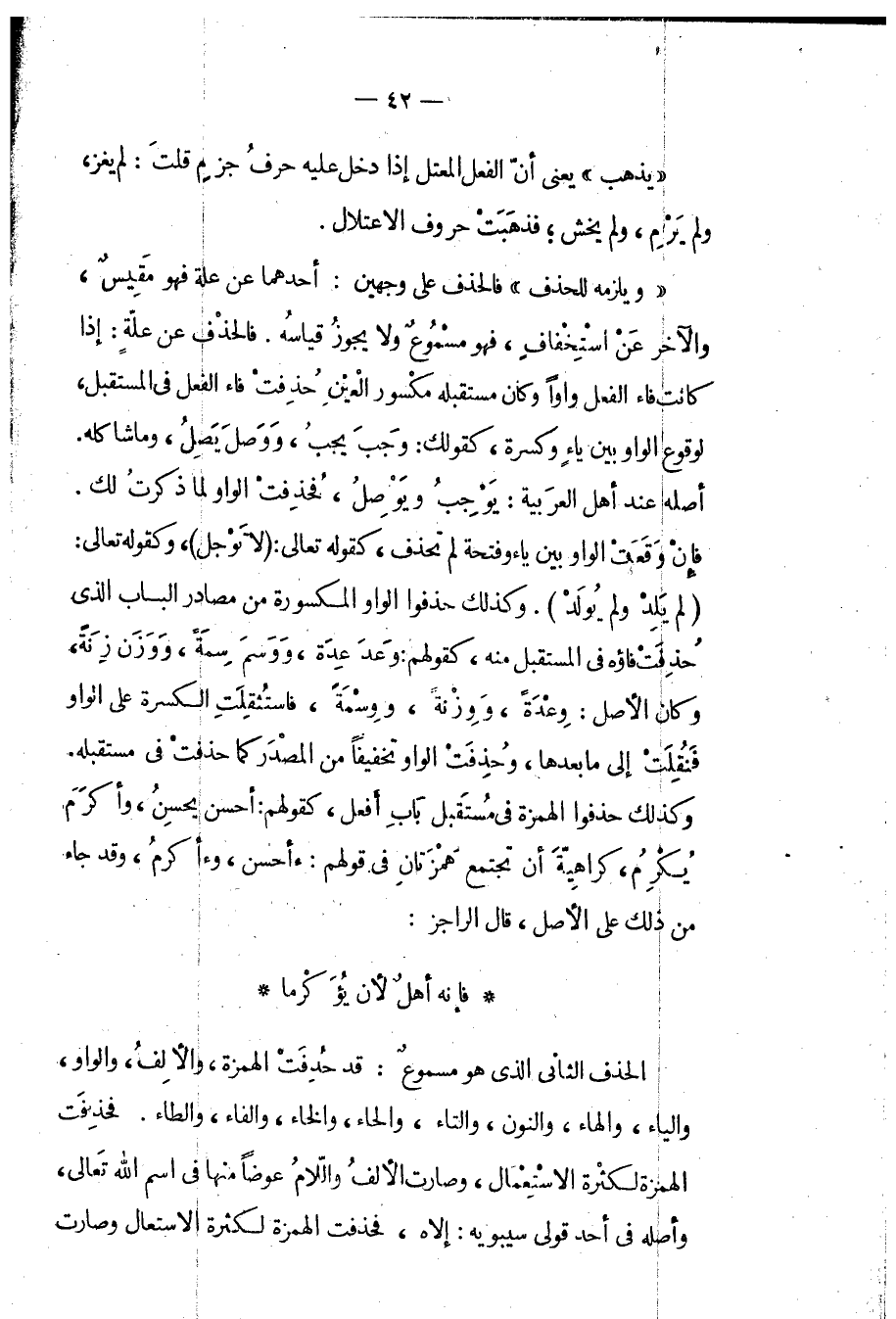 ويلزمه للحذف فالحذف على وجهين: أحدهما عن علة فهو مقيس، والآخر عن استخفاف، فهو مسموع ولا يجوز قياسه. فالحذف عن علة: إذا كانت فاء الفعل واواً وكان مستقبله مكسور العين حذفت فاء الفعل في المستقبل، لوقوع الواو بين ياء وكسرة، كقولك: وجب يجب، ووصل يصل، وما شاكله. أصله عند أهل العربية: يوجب ويوصل، فحذفت الواو لما ذكرت لك. فإن وقعت الواو بين ياء وفتحة لم تحذف، كقوله تعالى: (لا توجل) ، وكقوله تعالى: (لم يلد ولم يولد) . وكذلك حذفوا الواو المكسورة من مصادر الباب الذي حذفت فاؤه في المستقبل منه، كقولهم: وعد عدة، ووسم سمة، ووزن زنة، وكان الأصل: وعدة، ووزنة، ووسمة، فاستثقلت الكسرة على الواو فنقلت إلى ما بعدها، وحذفت الواو تخفيفاً من المصدر كما حذفت في مستقبله. وكذلك حذفوا الهمزة في مستقبل باب أفعل، كقولهم: أحسن يحسن، وأكرم يكرم، كراهية أن تجتمع همزتان في قولهم: أحسن، وءأ كرم، وقد جاء من ذلك على الأصل، قال الراجز: