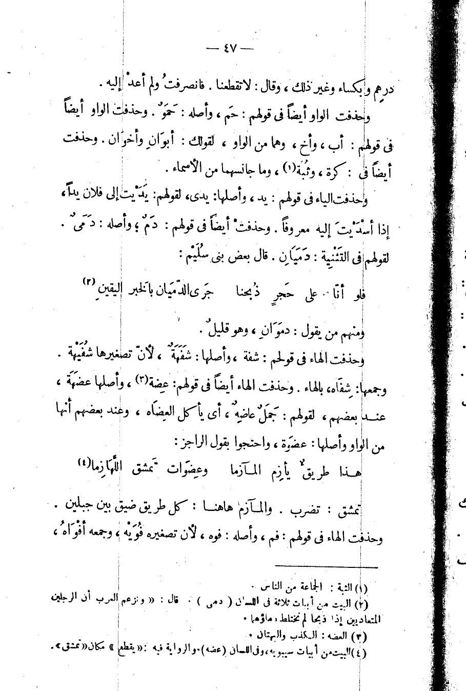 وحذفت الياء في قولهم: يد، وأصلها: يدي، لقولهم: يديت إلى فلان يداً، إذا أسديت إليه معروفاً. وحذفت أيضاً في قولهم: دم؛ وأصله: دميٌ. لقولهم في التثنية: دميان. قال بعض بني سليم: