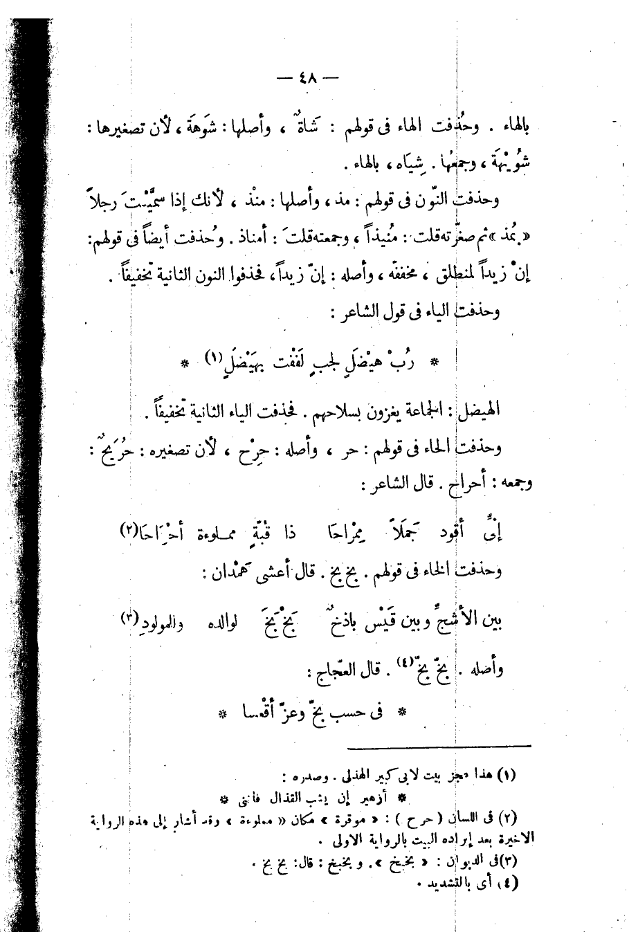 بالهاء. وحذفت الهاء في قولهم: شاةٌ، وأصلها: شوهة، لأن تصغيرها: شُويْهَة، وجمعها: شِيَاه، بالهاء.