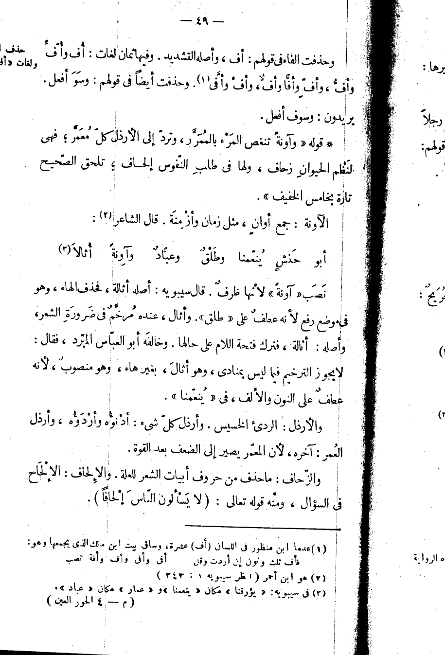 قوله وآونةً تنغص المرء بالممرر، وترد إلى الأرذل كل معمر؛ فهي لنظم الحيوان زحاف، ولها في طلب النفوس إلحاف؛ تلحق الصحيح تارة بخامس الخفيف.