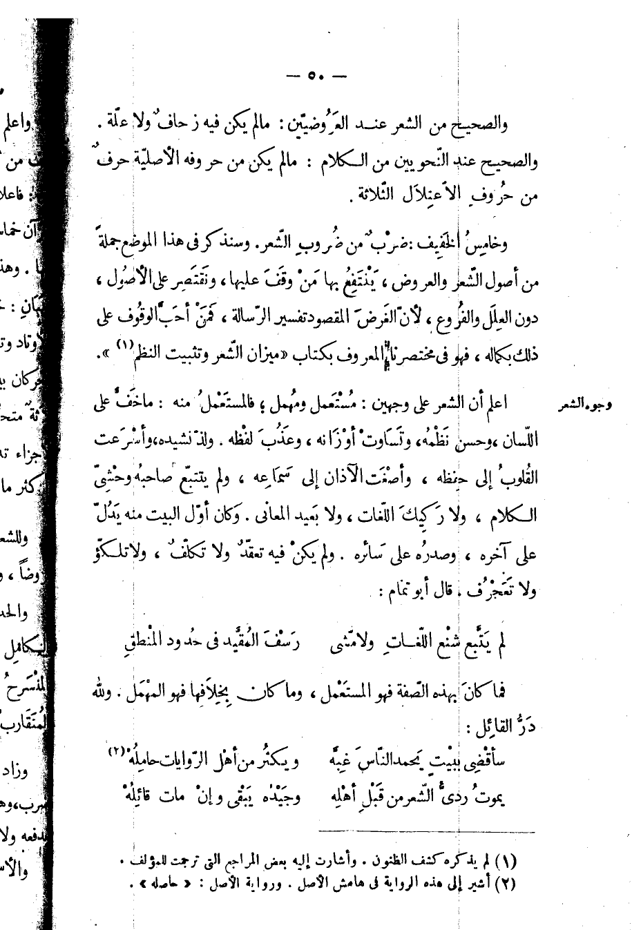 اعلم أن الشعر على وجهين: مستعمل ومهمل؛ فالمستعمل منه: ما خف على اللسان، وحسن نظمه، وتساوت أوزانه، وعذب لفظه. ولذ نشيده، وأسرعت القلوب إلى حفظه، وأصغت الآذان إلى سماعه، ولم يتتبع صاحبه وحشي الكلام، ولا ركيك اللغات، ولا بعيد المعاني. وكان أول البيت منه يدل على آخره، وصدره على سائره. ولم يكن فيه تعقد ولا تكلف، ولا تلكؤ ولا تعجرف. قال أبو تمام: