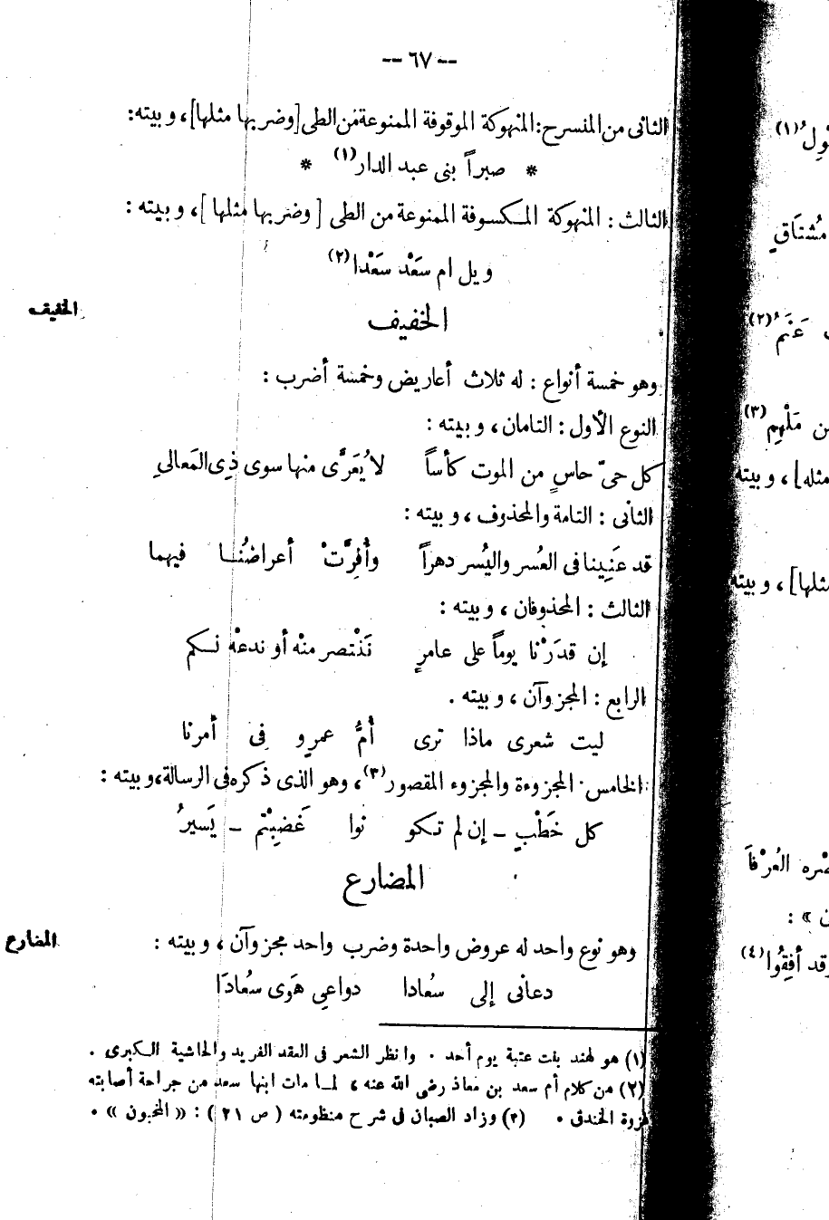 الثاني من المنسرح: المنهوكة الموقوفة الممنوعة من الطي وضربها مثلها، وبيته: