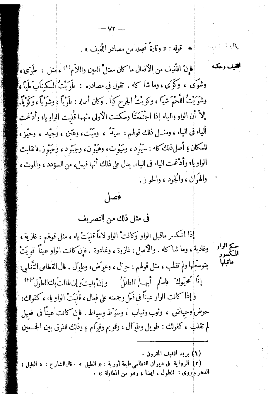 فإن اللفيف من الأفعال ما كان معتل العين واللام، مثل: طوى، وشوى، وكوى، وما شكله. تقول في مصادره: طويت الكتاب طياً، وشويت اللحم شياً، وكويت الجرح كياً. وكان أصله: طَوْياً، وشَوْياَ، وكَوْياً. إلا أن الواو والياء إذا اجْتَمَعَتَا وسكنت الأولى منهما قلبت الواو ياء وأدغمت الياء في الياء، ومثل ذلك قولهم: سيد، وميت، وهين، وجيد، وحيز، للمكان؛ أصل ذلك كله: سَيْوِد، ومَيْوِت، وهَيْوِن، وجَيْوِد، وحَيْوِز. فانقلبت الواو ياء وأدغمت الياء في الياء. يدل على ذلك أنها فيعل، من السؤدد، والموت، والهَوان، والجود، والحوز.