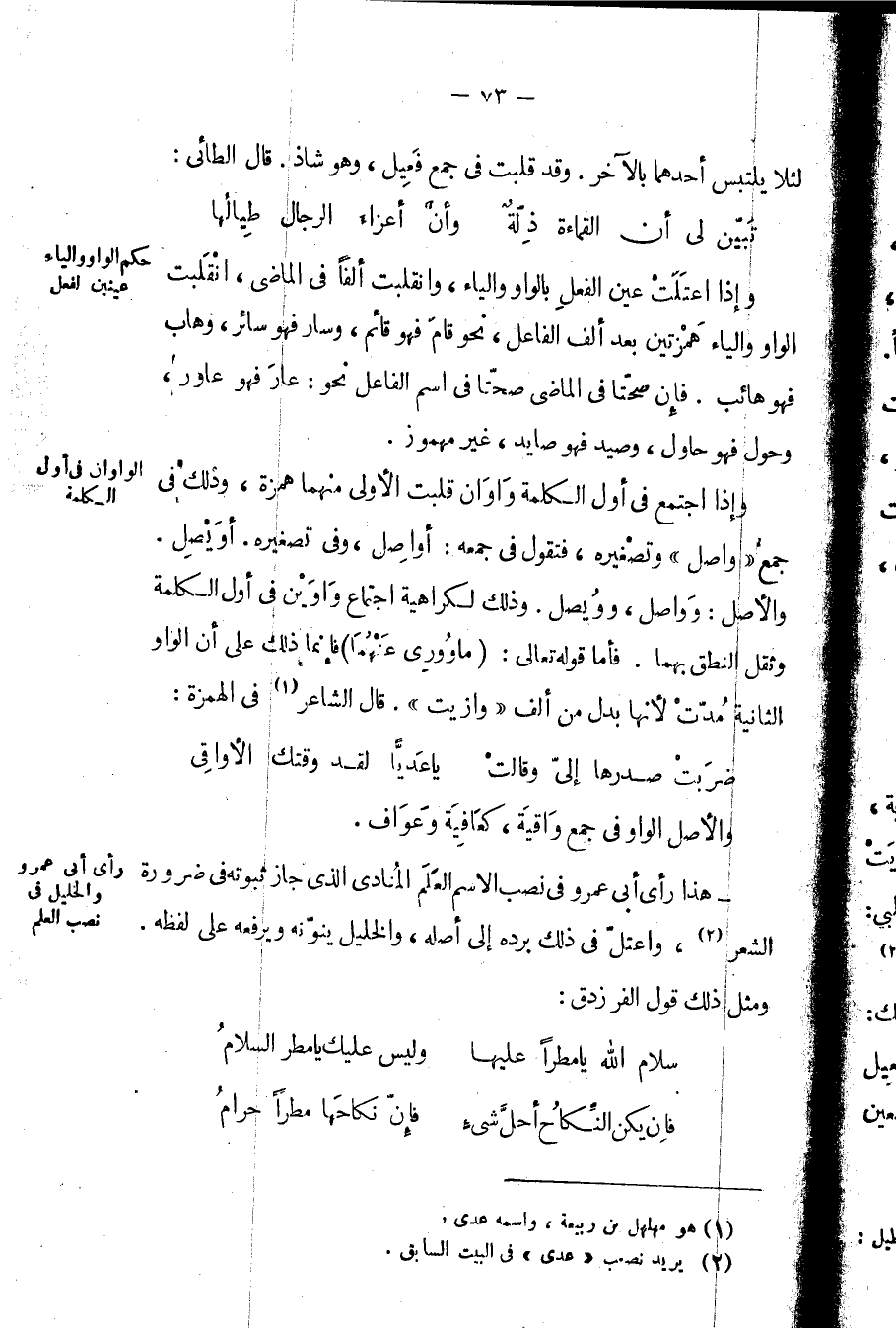 هذا رأي أبي عمرو في نصب الاسم العلم المنادى الذي جاز ثبوته في ضرورة الشعر، واعتل في ذلك برده إلى أصله، والخليل ينونه ويرفعه على لفظه. ومثل ذلك قول الفرزدق:
