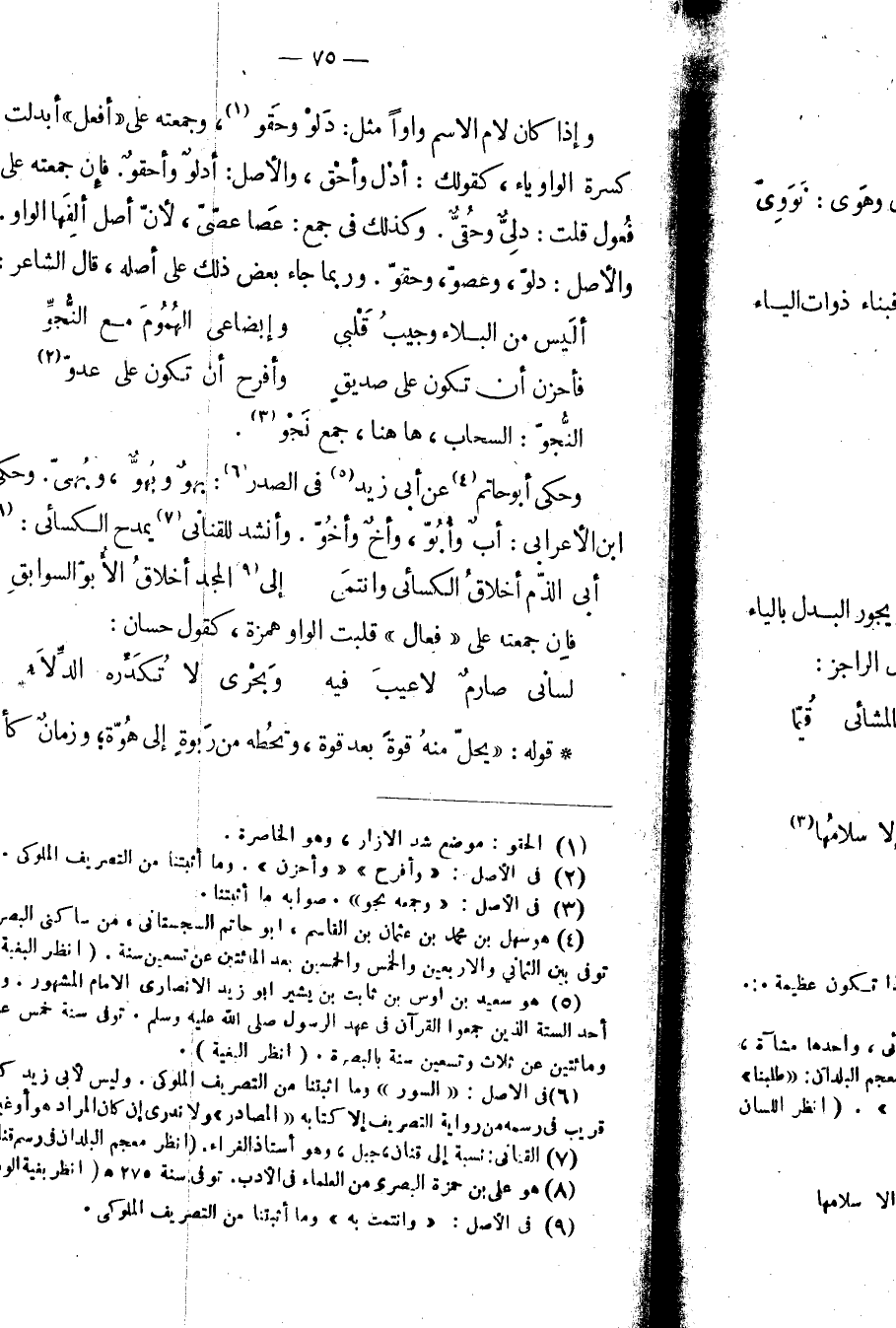وإذا كان لام الاسم واواً مثل: دَلوْ وحقَو، وجمعته على أفعل أبدلت كسرة الواو ياء، كقولك: أدل وأحْق، والأصل: أدلوٌ وأحقوٌ. فإن جمعه على فُعول قلت: دلِيٌّ وحُقيٌّ. وكذلك في جمع عَصا عصّيّ، لأن أصل ألِفها الواو. والأصل: دلو، وعصوّ، وحقوّ. وربما جاء بعض ذلك على أصله، قال الشاعر: