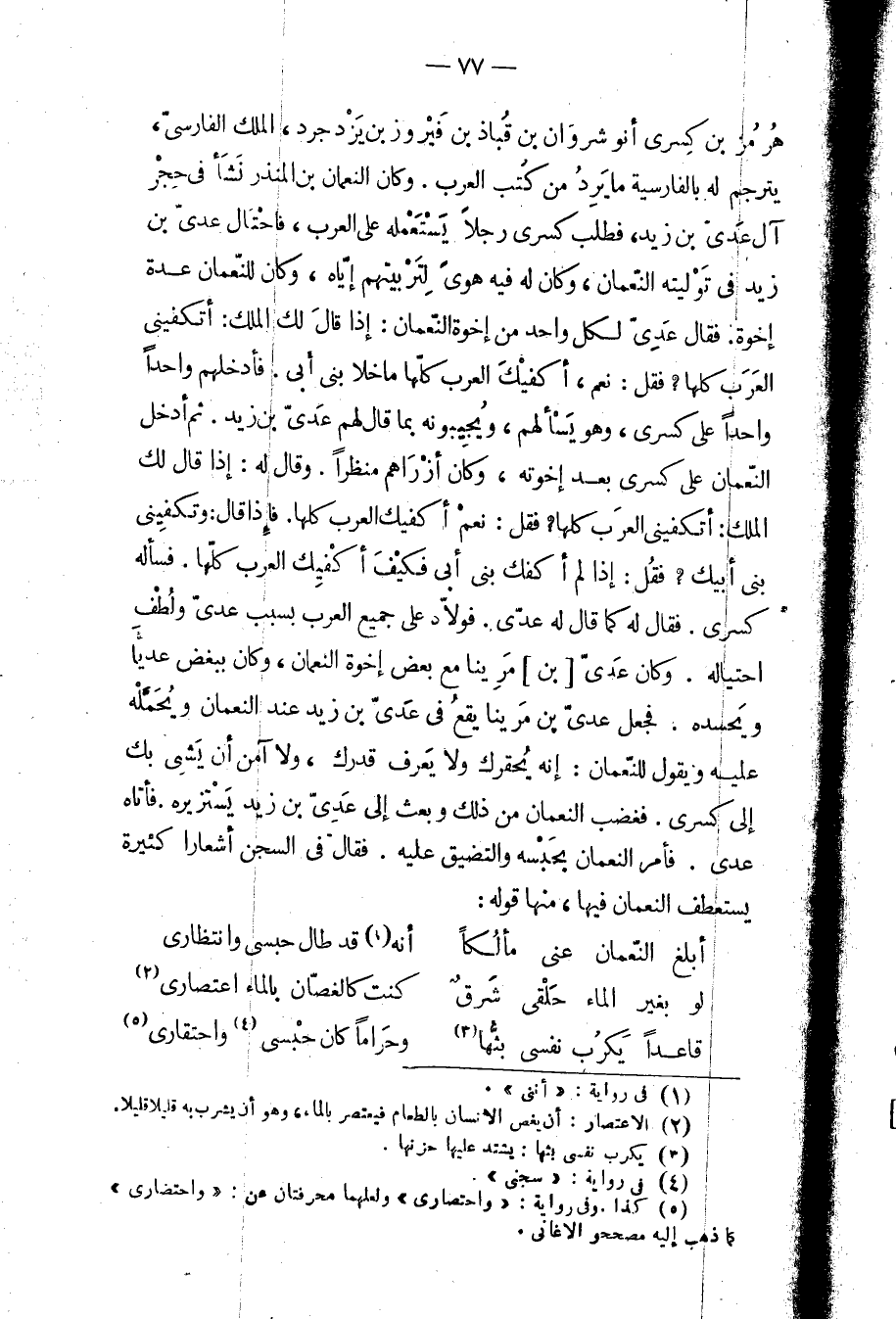 هر من بن كسرى أنو شروان بن قباذ بن فيروز بن يزد جرد، الملك الفارسي، يترجم له بالفارسية ما يرد من كتب العرب. وكان النعمان بن المنذر نشأ في حجر آل عدي بن زيد، فطلب كسرى رجلاً يستعمله على العرب، فاحتال عدي بن زيد في توليته النعمان، وكان له فيه هوى لتربيتهم إياه، وكان للنعمان عدة إخوة. فقال عدي لكل واحد من إخوة النعمان: إذا قال لك الملك: أتكفيني العرب كلها؟ فقل: نعم، أكفيك العرب كلها ما خلا بني أبي. فأدخلهم واحداً واحداً على كسرى، وهو يسألهم، ويجيبونه بما قال لهم عدي بن زيد. ثم أدخل النعمان على كسرى بعد إخوته، وكان أزراهم منظراً. وقال له: إذا قال لك الملك: أتكفيني العرب كلها؟ فقل: نعم أكفيك العرب كلها. فإذا قال: وتكفيني بني أبيك؟ فقل: إذا لم أكفك بني أبي فكيف أكفيك العرب كلها. فسأله كسرى. فقال له كما قال له عدي. فولاه على جميع العرب بسبب عدي ولطف احتياله. وكان عدي بن مرينا مع بعض إخوة النعمان، وكان ببغض عدياً ويحسده. فجعل عدي بن مرينا يقع في عدي بن زيد عند النعمان ويحمله عليه ويقول للنعمان: إنه يحقرك ولا يعرف قدرك، ولا آمن أن يشي بك إلى كسرى. فغضب النعمان من ذلك وبعث إلى عدي بن زيد يستزيره. فأتاه عدي. فأمر النعمان بحبسه والتضيق عليه. فقال في السجن أشعاراً كثيرة يستعطف النعمان فيها، منها قوله: