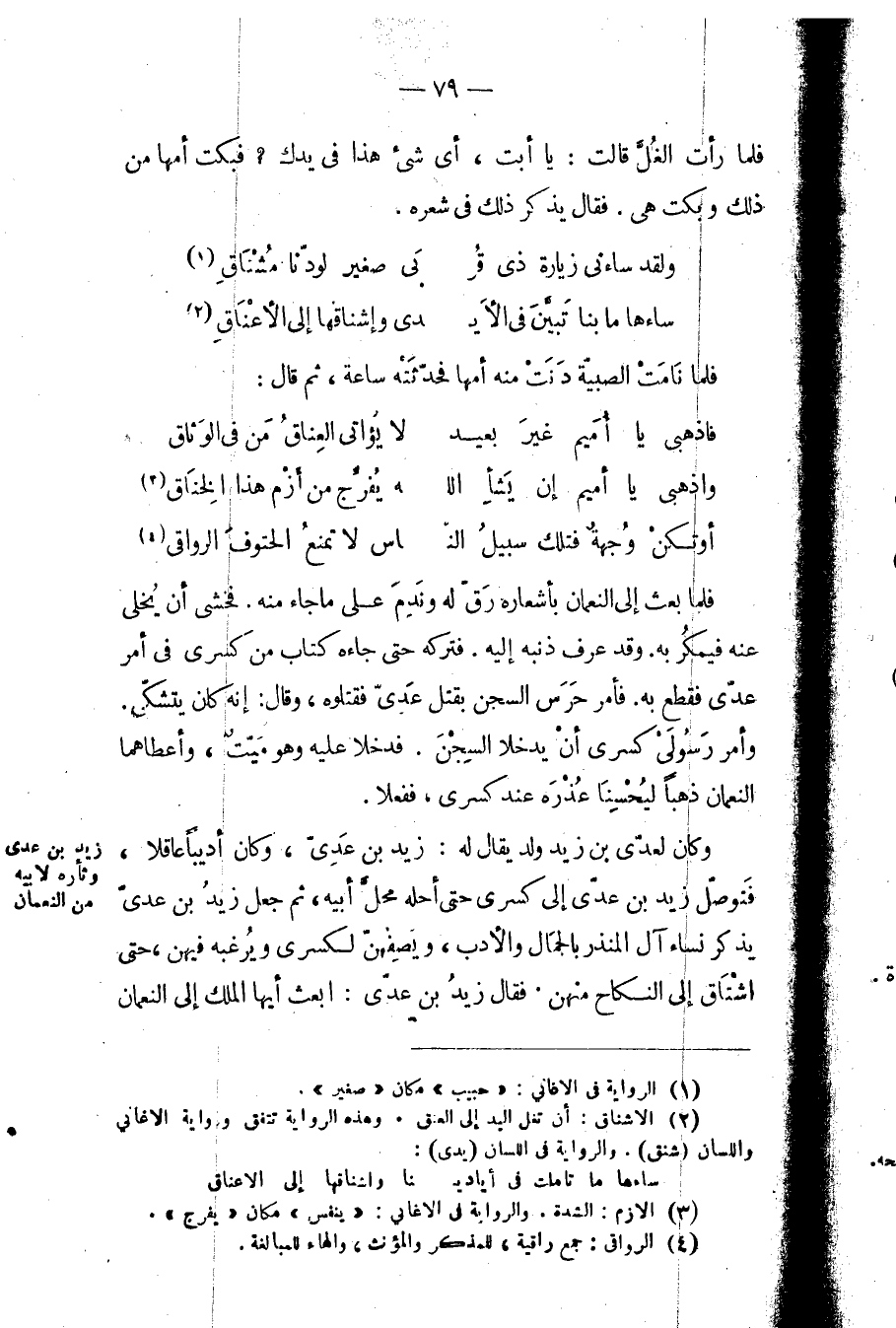 وكان لعدي بن زيد ولد يقال له: زيد بن عدي، وكان أديباً عاقلاً، فتوصل زيد بن عدي إلى كسرى حتى أحله محل أبيه، ثم جعل زيد بن عدي يذكر نساء آل المنذر بالجمال والأدب، ويصفهن لكسرى ويرغبه فيهن، حتى اشتاق إلى النكاح منهن فقال زيد بن عدي: ابعث أيها الملك إلى النعمان