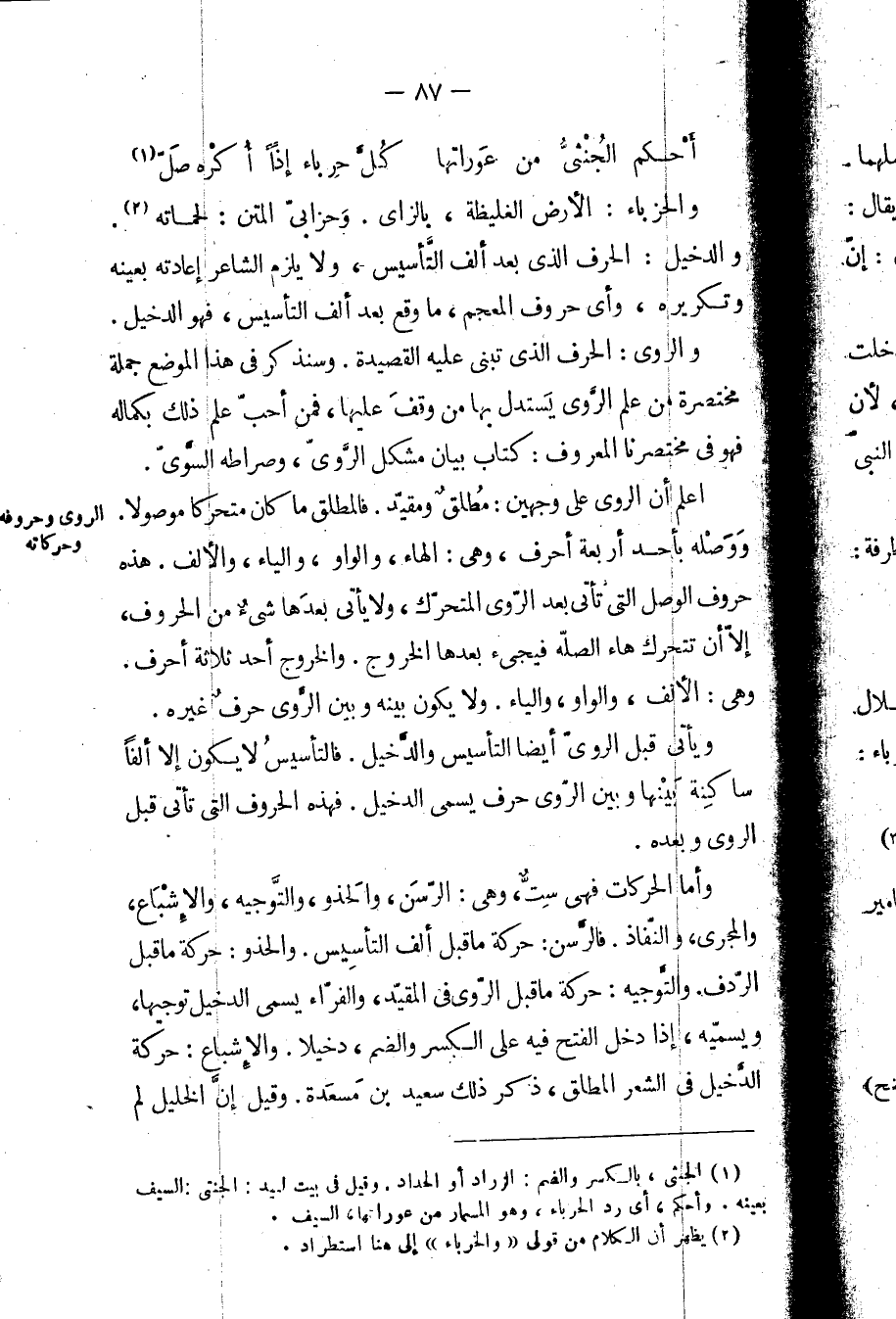 والروي: الحرف الذي تبنى عليه القصيدة. وسنذكر في هذا الموضع جملة مختصرة من علم الروي يستدل بها من وقف عليها، فمن أحب علم ذلك بكماله فهو في مختصرنا المعروف: كتاب بيان مشكل الروي، وصراطه السوي.