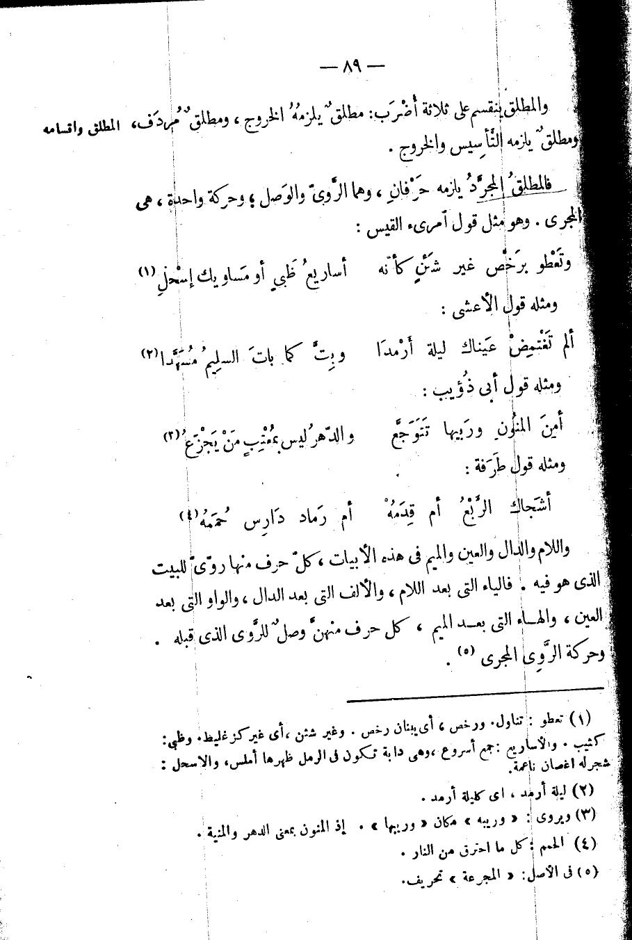 فالمطلق المجرد يلزمه حرفان، وهما الروي والوصل؛ وحركة واحدة، هي المجرى. وهو مثل قول امرئ القيس: