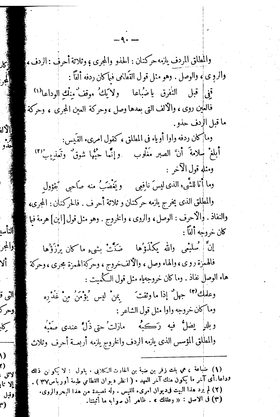 والمطلق المردف يلزمه حركتان: الحذو والمجرى؛ وثلاثة أحرف: الدف، والروي، والوصل. وهو مثل قول القطامي فيما كان ردفه ألفاً: