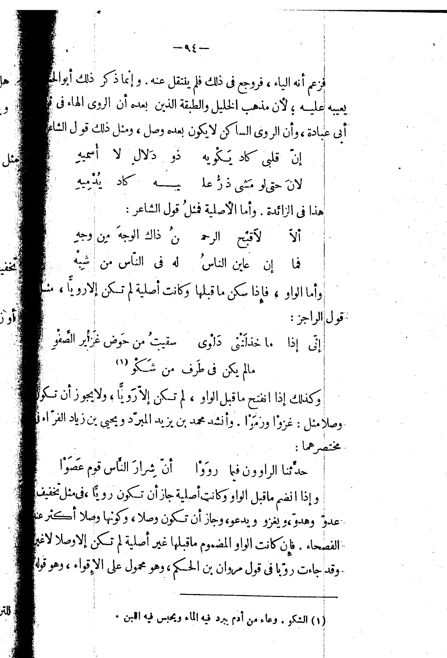 وإذا انضم ما قبل الواو وكانت أصلية جاز أن تكون روياً، في مثل تخفيف: عدو وهدو، ويغزو ويدعو، وجاز أن تكون وصلاً، وكونها وصلاً أكثر عند الفصحاء. فإن كانت الواو المضموم ما قبلها غير أصلية لم تكن إلا وصلاً لا غير. وقد جاءت روياً في قول مروان بن الحكم، وهو محمول على الإقواء، وهو قوله:
