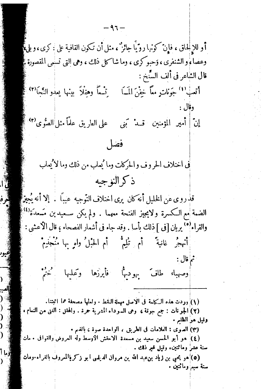 قد روي عن الخليل أنه كان يرى اختلاف التوجيه عيباً. إلا أنه يجيز الضمة مع الكسرة ولا يجيز الفتحة معهما. ولم يكن سعيد بن مسعدة والقراء يريان في ذلك بأساً. وقد جاء في أشعار الفصحاء؛ قال الأعشى: