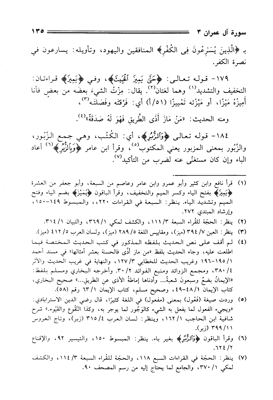 184 - قوله تعالى (وَالزُّبُرِ)، أي: الكُتُب، وهي جمع الزَّبور، والزَّبُور بمعنى المزبور يعني المكتوب، وقرأ ابن عامر (وَبِالزُّبُرِ) أعاد الباء وإن كان مستغنًى عنه لضرب من التأكيد.