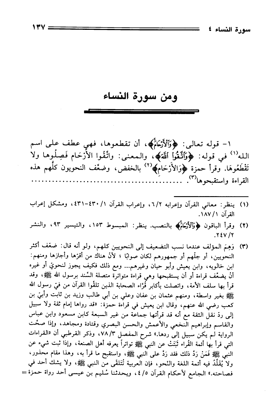 1 - قوله تعالى: (وَالْأَرْحَامَ)، أن تقطعوها، فهي عطف على اسم الله (¬1) في قوله: (وَاتَّقُوا اللَّهَ)، والمعنى: واتقُوا الأرْحَام فَصِلُوها ولا تَقْطَعُوهَا. وقرأ حمزة (وَالْأَرْحَامِ) (¬2) بالخفض، وضعَّف النحويون كلهم هذه القراءة واستقبحوها (¬3). . . . . . . . . . ..