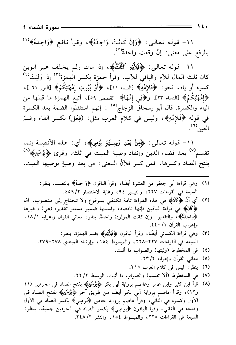 11 - قوله تعالى: (وَإِنْ كَانَتْ وَاحِدَةً)، وقرأ نافع (وَاحِدَةٌ) بالرفع على معنى: إنْ وقعت واحدةٌ.
