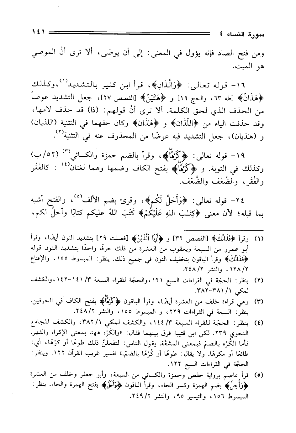 24 - قوله تعالى: (وَأَحَلَّ لَكُم)، وقرئ بضم الألف، والفتح أشبه بما قبله؛ لأن معنى (كِتَابَ اللهِ عَلَيْكُمْ) كَتَبَ اللَّهُ عليكم كتابًا وأَحلَّ لكم،