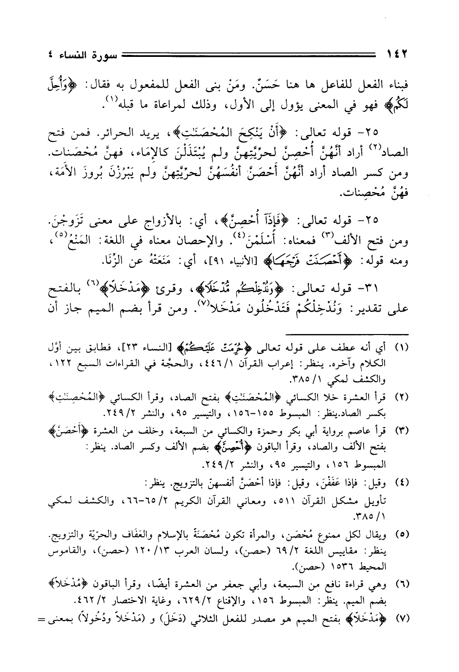 25 - قوله تعالى: (أَنْ يَنْكِحَ الْمُحْصَنَاتِ)، يريد الحرائر. فمن فتح الصاد أراد أنَّهُن أُحْصِنَّ لحريتِهنَّ ولم يُبْتَذَلْنَ كالإِمَاء، فهنَّ مُحْصَنات. ومن كسر الصاد أراد أنهُن أَحْصَن أنفُسَهُنَّ لحريتِهن ولم يَبْرُزْنَ بُروزَ الأَمَة، فهُن مُحْصِنات.