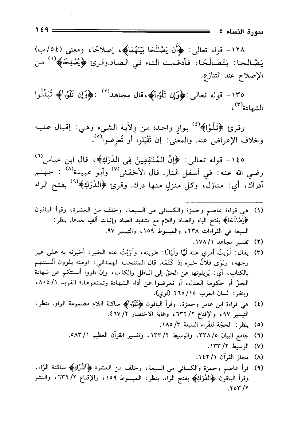 135 - قوله تعالى: (وَإِنْ تَلْوُوا)، قال مجاهد: (وَإِنْ تَلْوُوا) تُبَدِّلُوا الشهادة، وقرئ (تَلُوْا) بواوِ واحدة من وِلاية الشيء وهي: إقبال عليه وخلاف الإعراض عنه. والمعنى: إن تَقْبَلوا أو تُعرِضوا.